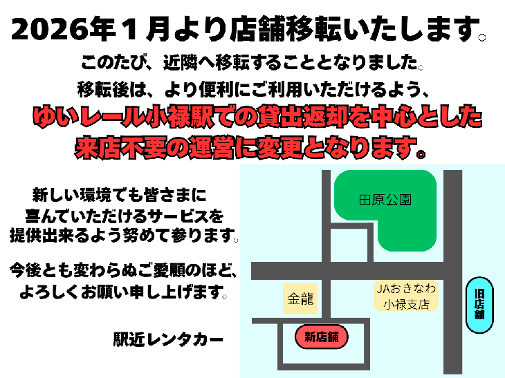 当店、ゆいレール小禄駅での貸出返却となっております。
