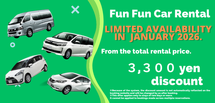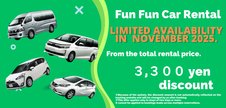 Rental cars will be available at the following locations Fukuoka Airport International/Domestic Flights, Hakata Station, your Hotel. Convenient to rent a car right away with no need to come to the store!