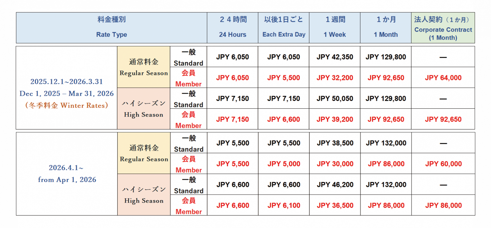 ※ For corporate contracts, during the regular season, the 24-hour and 1-week rates are offered at the member price, while the 1-month rate is applied at the corporate monthly rate (a special discounted rate).
