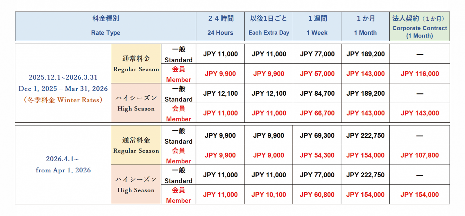※法人契約の料金は、通常期間中は「24時間・1週間料金=会員価格」、「1か月料金=法人契約1か月料金(専用の割引価格)」となります。ハイシーズン期間中は、会員料金と同一となります(月額料金に割引は適用されません)。