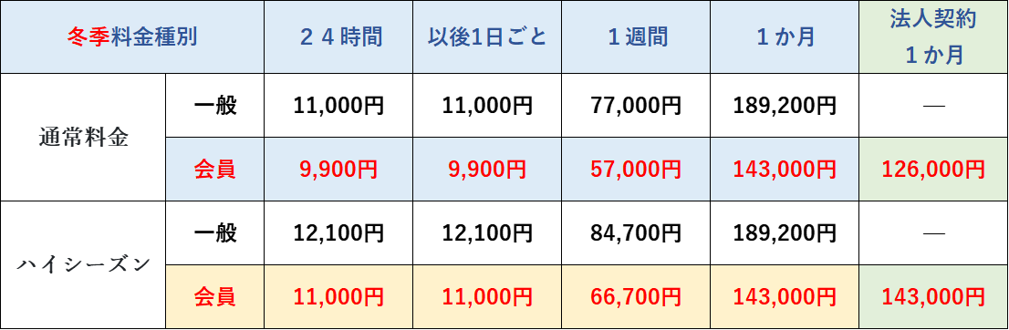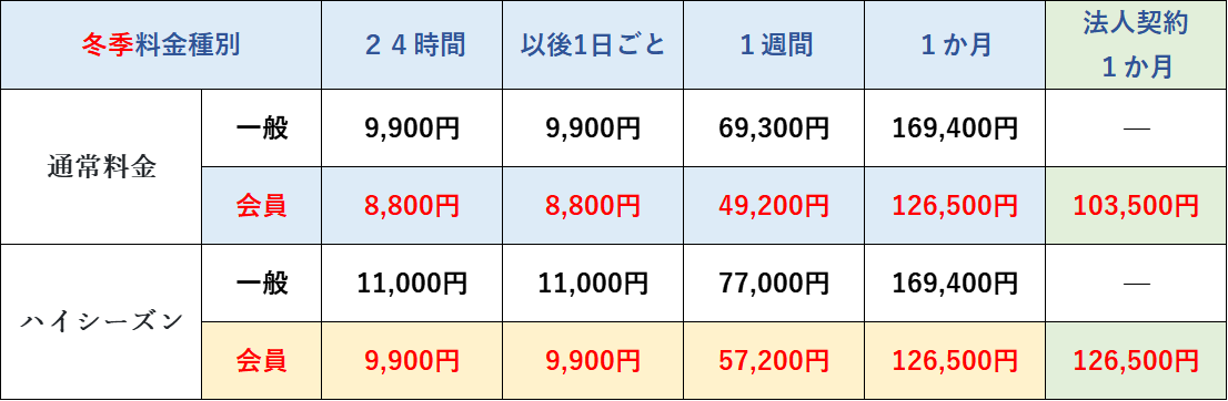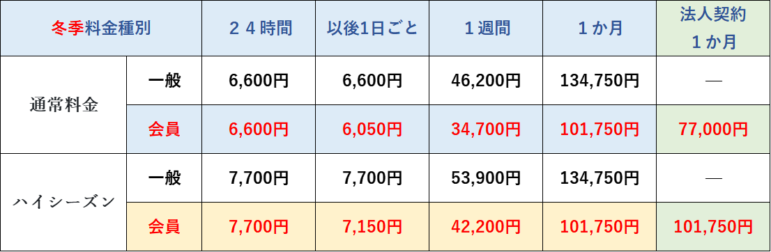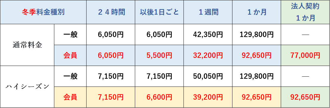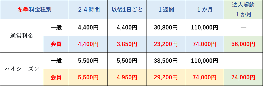 * 法人契約の料金は、通常期間中は「24時間・1週間料金=会員価格」、「1か月料金=法人契約1か月料金(専用の割引価格)」となります。ハイシーズン期間中は、会員料金と同一となります(月額料金に割引は適用されません)。