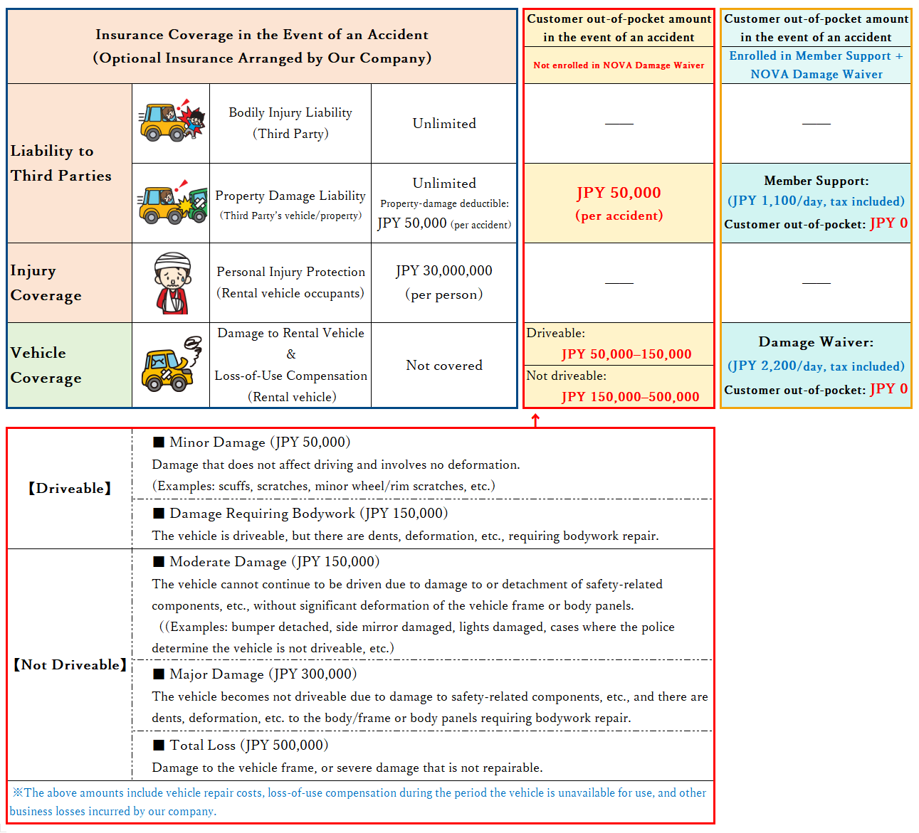 ・The customer is also responsible for damage to our rental vehicle and the loss-of-use compensation incurred during the repair period. Please refer to the chart/table below for details.