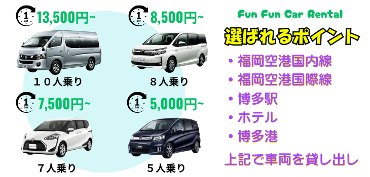レンタカーの貸し出しを以下の場所で行います。 福岡空港国際線/国内線、博多駅、ホテル 来店不要ですぐ借りれて便利!