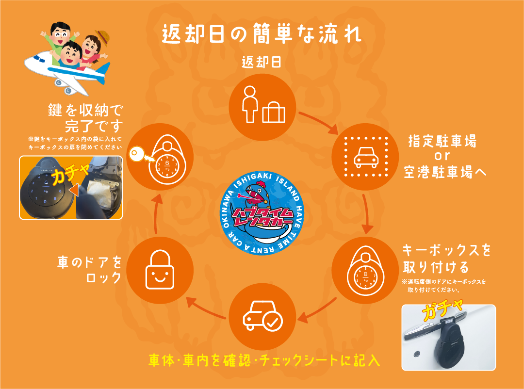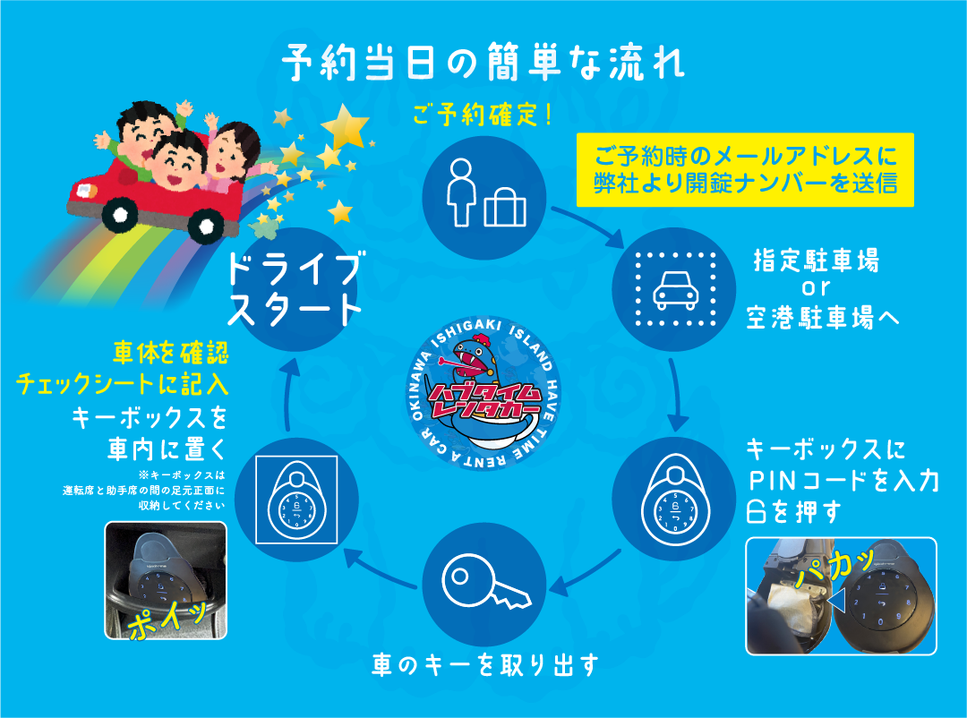 当店では、カーシェアのような対面なしの簡単システムとなっています。 予約後のご乗車からご返却までの流れについては下図をご参照ください。 ご不明な点がございましたら、お問い合わせください。