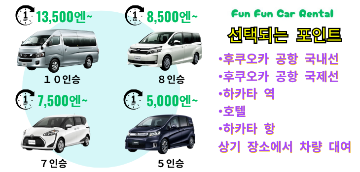 렌터카 대여를 다음 장소에서 실시합니다. 후쿠오카 공항 국제선/국내선, 하카타역, 호텔 방문할 필요없이 바로 빌릴 수 있어 편리합니다!