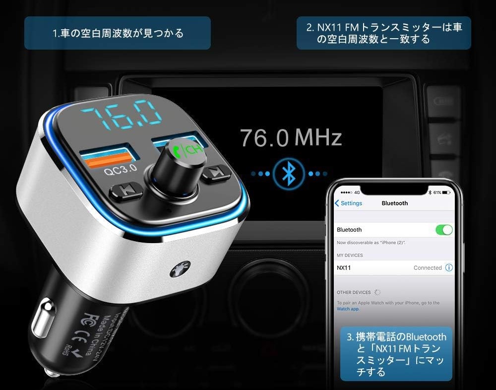 2.本体に表示されるFM周波数に、車両のFMラジオを合わせます。