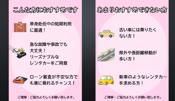 免許取得半年以内の方の貸出はご遠慮させて頂きます。