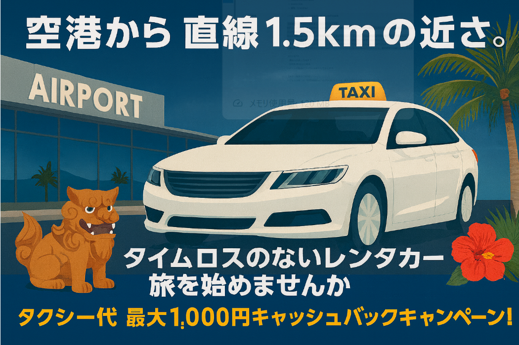 タクシー領収書を受付にてご提示いただければご予約レンタカー1台に対して最大1,000円キャッシュバックさせていただきます。領収書のご提示がない場合は対象外となりますのでご注意ください。那覇空港以外からのタクシーキャッシュバックは行っておりませんので、ご了承ください。